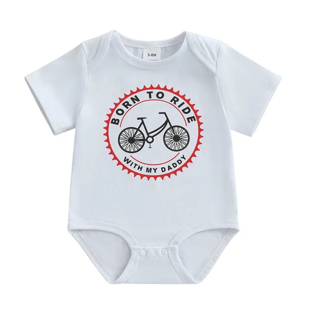 Celebrate the special bond between dad and baby with this "Born To Ride With My Daddy" bodysuit. Featuring a fun bicycle graphic in a red gear badge design, this white bodysuit is perfect for little cycling enthusiasts and their dads.