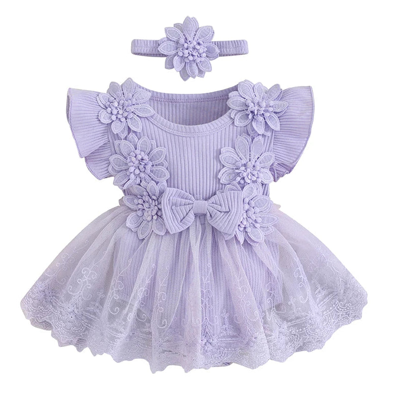 Make every moment picture-perfect with the Maisie Floral Romper Dress. This adorable two-piece set features a soft ribbed bodice with delicate floral appliqués, front statement bow and dreamy tulle overlay skirt.