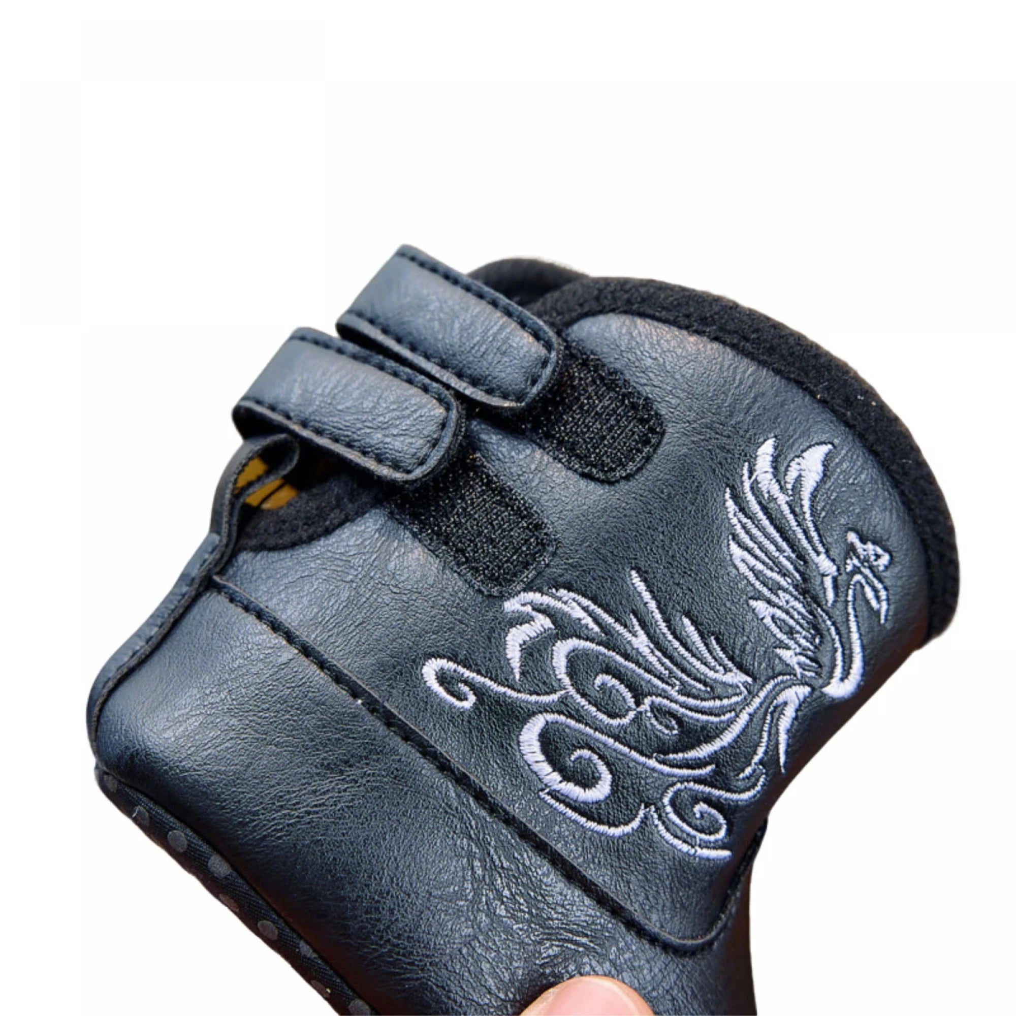 Soft faux leather baby boots with embroidered Western design and easy velcro straps. Perfect for little cowpokes learning to walk or crawl.