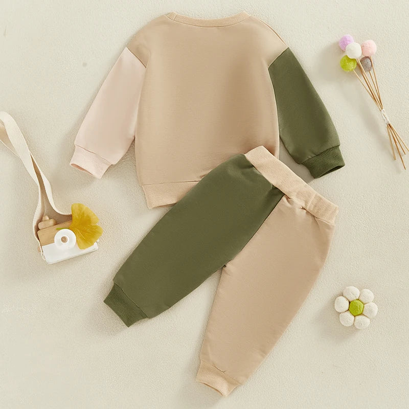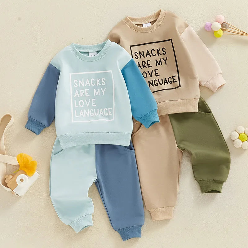 A fun two-piece tracksuit set featuring a "Snacks Are My Love Language" top and matching joggers. The colour-block design makes this perfect for playtime and casual outings.